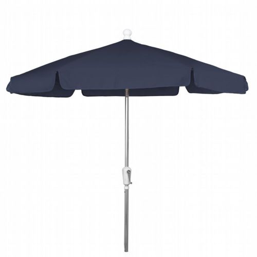 7.5' Hexagon Garden Umbrella 6 Rib Crank Lift & Push Button Tilt Bright Aluminum Frame with Valance Style Canopy in Navy Blue Vinyl Coated Weave. Designed with the home in mind, FiberBuilt's Garden Umbrella provides years of shaded comfort for your backyard patio, garden, or pool area. These light-duty, budget-friendly umbrellas can be used both in-table and freestanding. They are not designed for high wind locations or for commercial use. The valance style canopy is hexagonal in shape, available in 10 colors, and made of a durable Vinyl coated weave that partially protects from harmful sun rays. Features 6 flexible fiberglass ribs with molded nylon joints, hubs, and end tips that improve the umbrella's performance during adverse weather conditions.