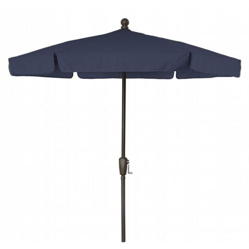 7.5' Hexagon Garden Umbrella 6 Rib Crank Lift Champagne Bronze Frame with Valance Style Canopy in Navy Blue Vinyl Coated Weave. Designed with the home in mind, FiberBuilt's Garden Umbrella provides years of shaded comfort for your backyard patio, garden, or pool area. These light-duty, budget-friendly umbrellas can be used both in-table and freestanding. They are not designed for high wind locations or for commercial use. The valance style canopy is hexagonal in shape, available in 10 colors, and made of a durable Vinyl coated weave that partially protects from harmful sun rays. Features 6 flexible fiberglass ribs with molded nylon joints, hubs, and end tips that improve the umbrella's performance during adverse weather conditions.