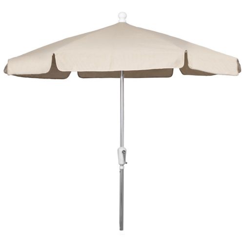 7.5 feet diameter fiberglass ribbed garden umbrella with standard Textiline fabric top. Garden umbrella has a white powder coated aluminum 2 piece pole with crank lift. Pole has two pieces. Umbrella has a heavy-duty crank. Umbrella top has 6 ribs. Fiber glass ribs have molded nylon joints and end tips. Fiberglass patio umbrellas withstand high winds and resistant to harsh weather. Umbrella stand sold separately.