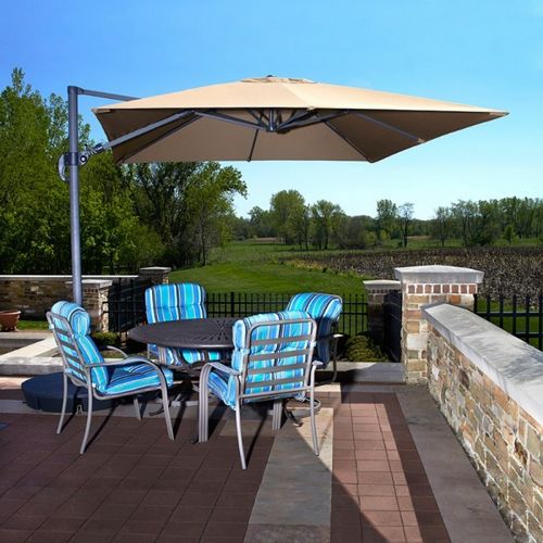 Add the Santorini II cantilever umbrella to your backyard for the ultimate in shade and style! The Santoirini II is available in Premium Sunbrella Acrylic backed by a 5 Year Warranty against color fading. The rugged, anodized aluminum pole is backed by a 2-year Warranty.